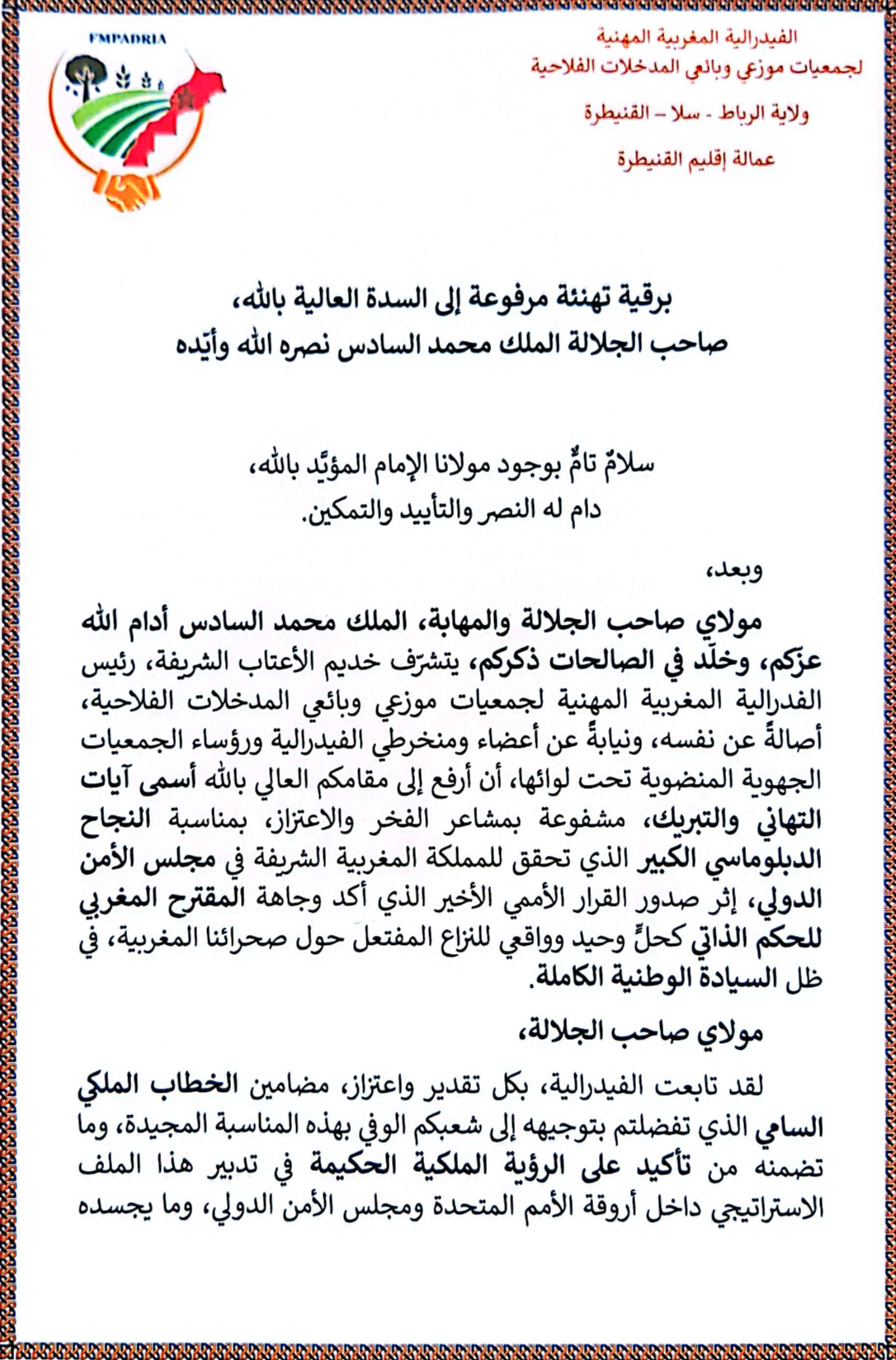 رفع عبد الله العلمي، رئيس الفيدرالية المغربية المهنية لجمعيات موزعي وبائعي المدخلات الفلاحية، برقية تهنئة وإكبار إلى السدة العالية بالله صاحب الجلالة الملك محمد السادس نصره الله وأيده، باسم الفيدرالية وأعضائها ومنخرطيها، وذلك بمناسبة النجاح الدبلوماسي الكبير الذي حققته المملكة المغربية في مجلس الأمن الدولي.