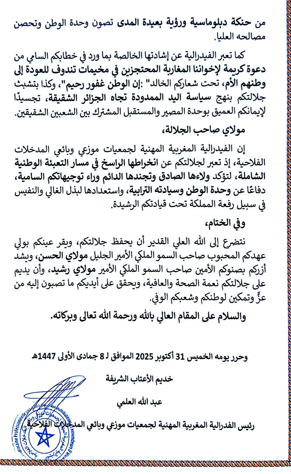 كما نوهت الفيدرالية بدعوة جلالة الملك للمغاربة المحتجزين في مخيمات تندوف إلى العودة إلى الوطن الأم تحت شعار “إن الوطن غفور رحيم”، وبتمسك جلالته بسياسة اليد الممدودة تجاه الجزائر الشقيقة، تجسيداً لإيمانه العميق بوحدة المصير والمستقبل المشترك بين الشعبين.