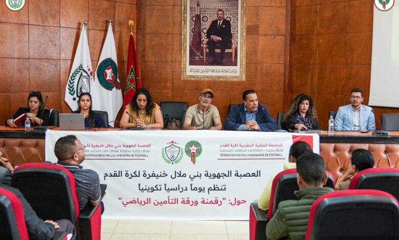 نظمت العصبة الجهوية بني ملال–خنيفرة لكرة القدم، يوم الخميس 23 أبريل 2026، ورشاً تكوينياً حول رقمنة ورقة التأمين الرياضي، وذلك بقاعة الاجتماعات التابعة لغرفة التجارة والصناعة والخدمات ببني ملال، لفائدة الأندية المنضوية تحت لوائها، في إطار مواكبة التحول الرقمي الذي تعرفه المنظومة الكروية الوطنية.